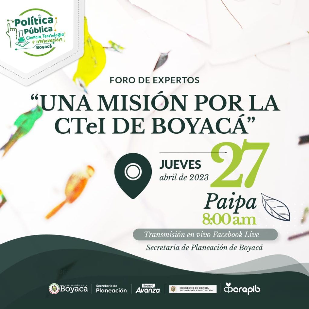 Tunja, 24 de abril de 2023. (UACP). La Secretaría de Planeación, comprometida con el desarrollo en el territorio de los boyacenses, realizará el Foro de Expertos “Una misión por la Ciencia, Tecnología e Innovación de Boyacá”, el día 27 de abril, en Paipa”, a partir de las 8:00 a.m.