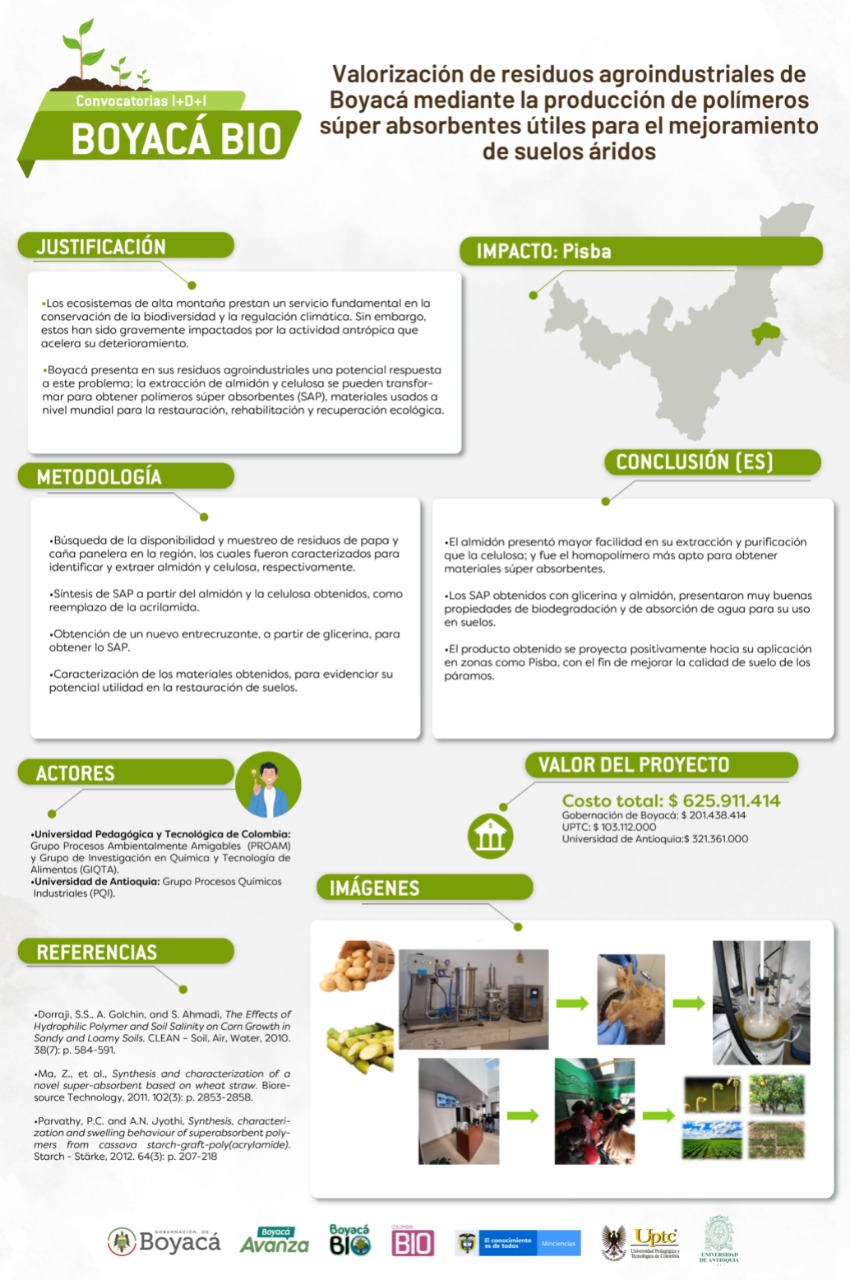 Objetivo: Desarrollar polímeros súper absorbentes (SAP) y degradables para el mejoramiento de suelos áridos y/o estériles a partir de componentes naturales provenientes de desechos agroindustriales propios de la región de Boyacá.