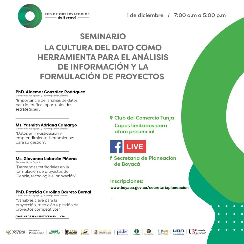 El próximo miércoles 1 de de diciembre la Secretaría de Planeación junto a las universidades Pedagógica y Tecnológica de Colombia; Juan de Castellanos; Santo Tomás; Nacional Abierta y a Distancia; Antonio Nariño; y de Boyacá realizarán el seminario ‘La cultura del dato como herramienta para el análisis de información y la formulación de proyectos’, durante todo el día en el Club del Comercio de la Capital boyacense y a través de Facebook.